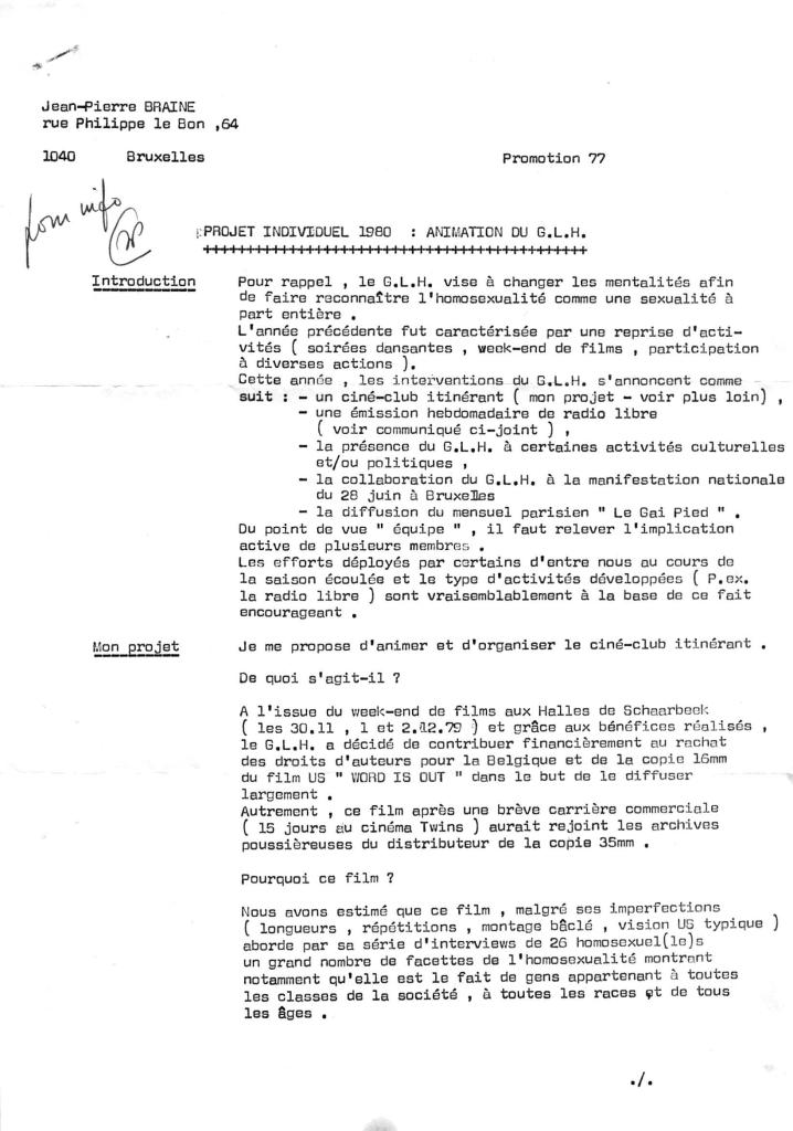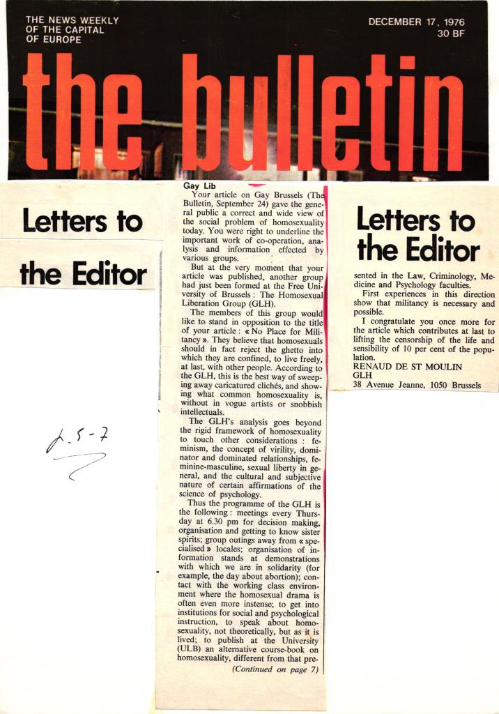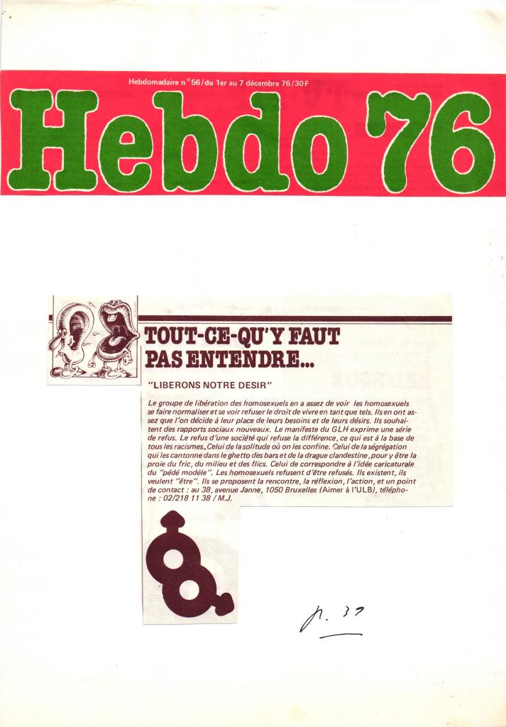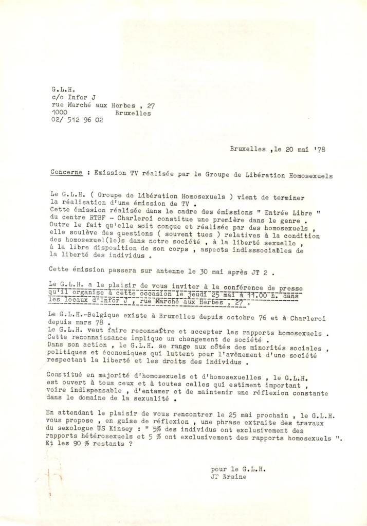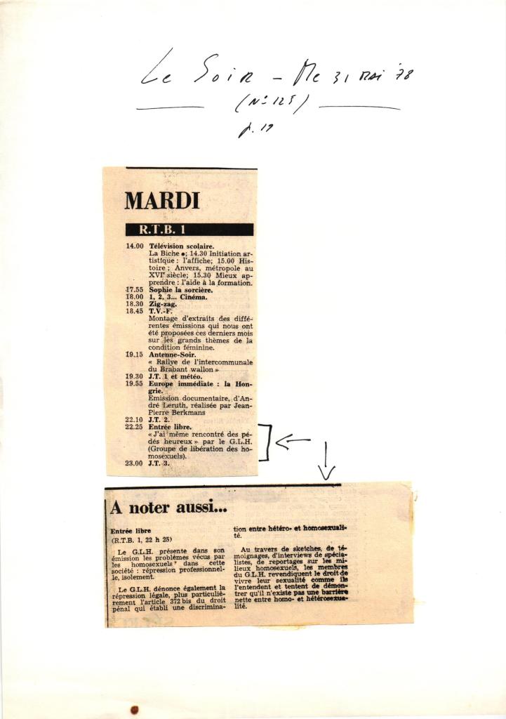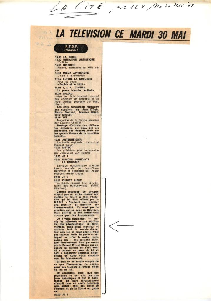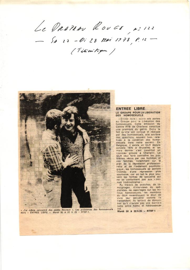 La RTBF avait développé un programme de reportages réalisés par le milieu associatif sous le terme générique « Entrée Libre ». Le reportage du GLH sera une première sur le sujet de l’homosexualité diffusé sur le service public.