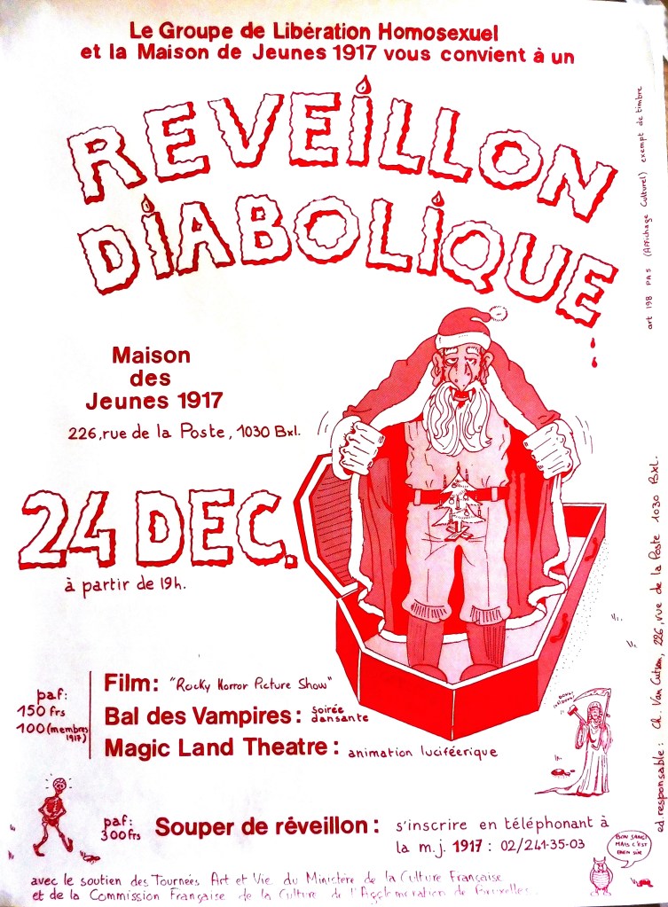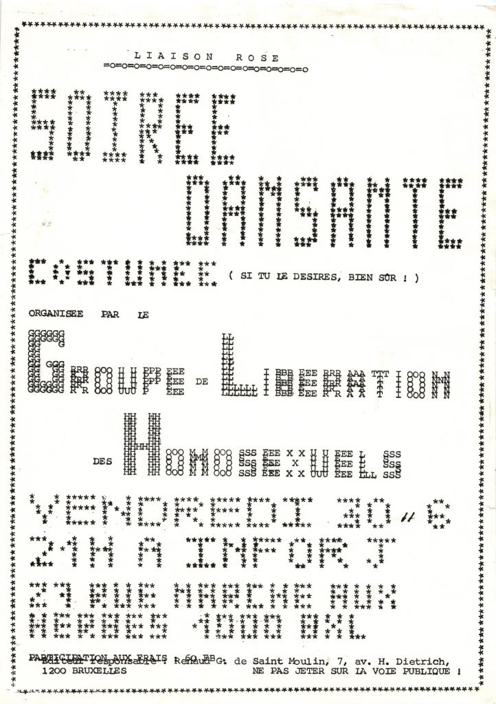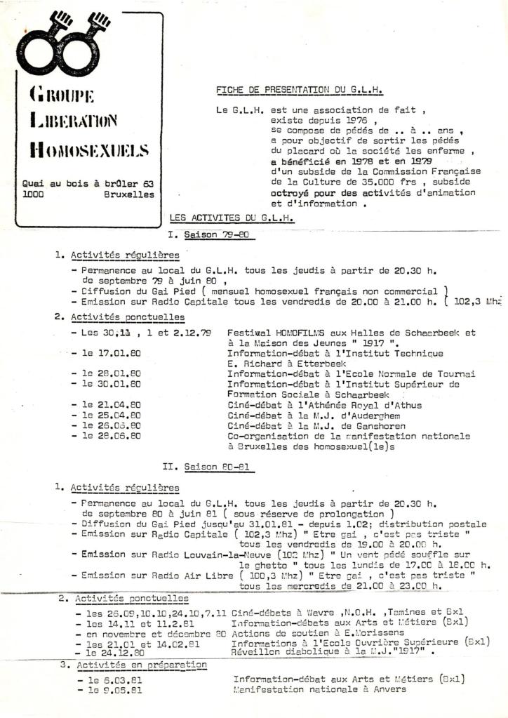Samedi 24/10 : 8H du matin, interview de membres du GLH à Radio Hainaut au Jardin du Maïeur. A partir de 9H30 distribution de tracts sur la Grand Place de Mons. En fin de journée, soirée dansante à la salle Waux-Hall de Mons. 1200 personnes y participèrent, une première en Wallonie!