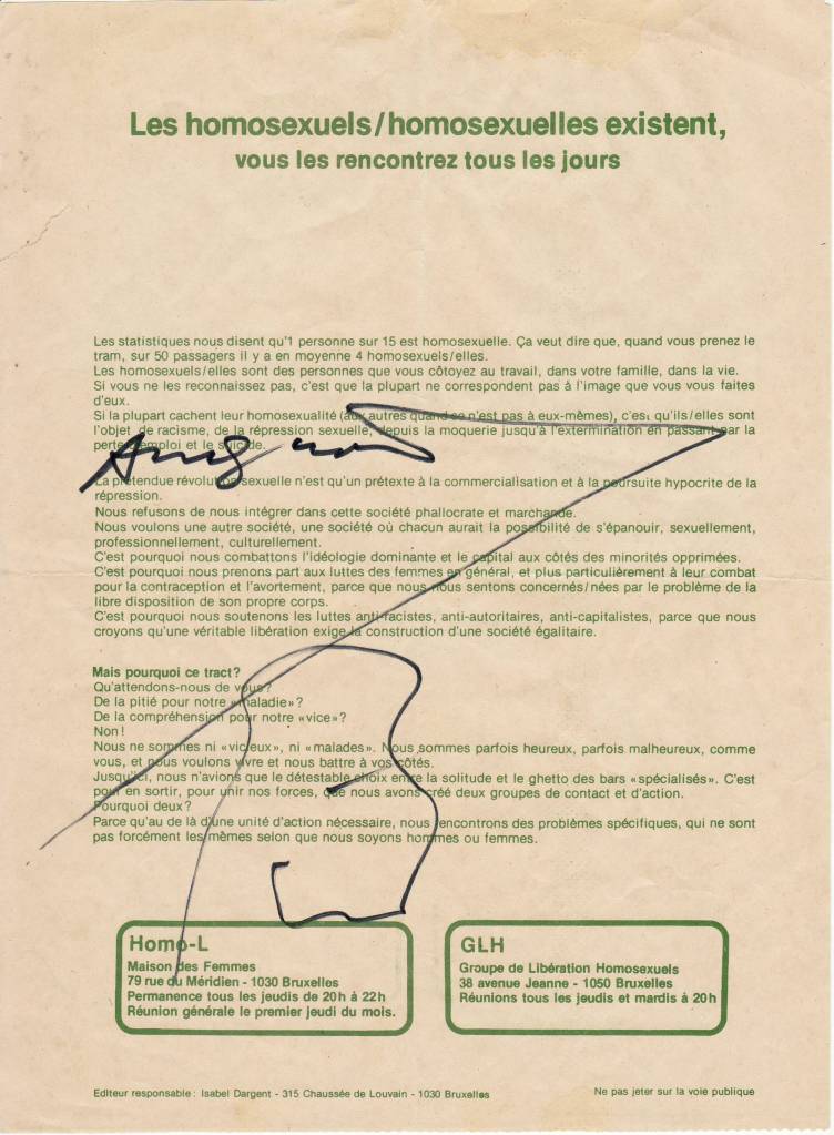 Distribution du tract du GLH et d’Homo – L au vernissage d’une exposition de Warhol consacrée à Hergé à la galerie D. de l’avenue Louise à Bruxelles. Andy Warhol esquisse rapidement une fleur et un autographe sur notre tract et sur une carte du ministère de la défense nationale.